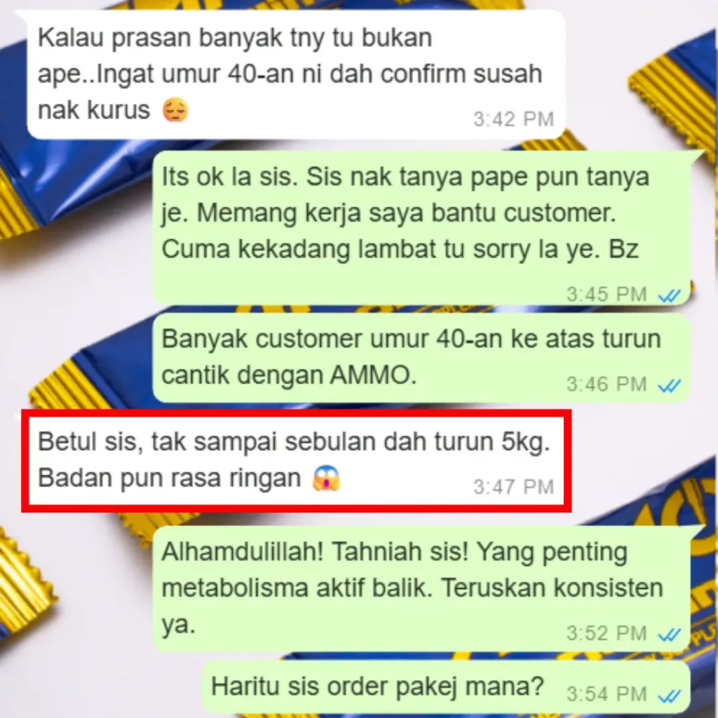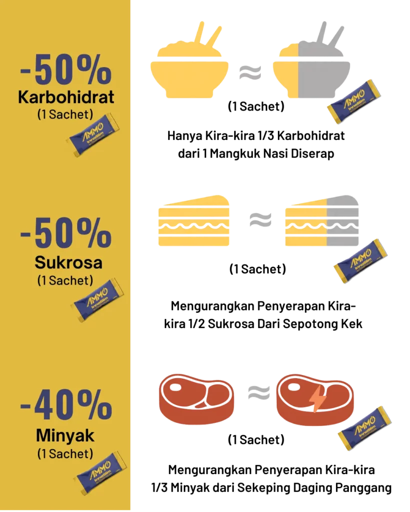 👉 Badan anda tetap boleh nikmati makanan harian tanpa rasa bersalah, sebab AMMO bantu block karbohidrat, gula & minyak daripada jadi lemak simpanan.