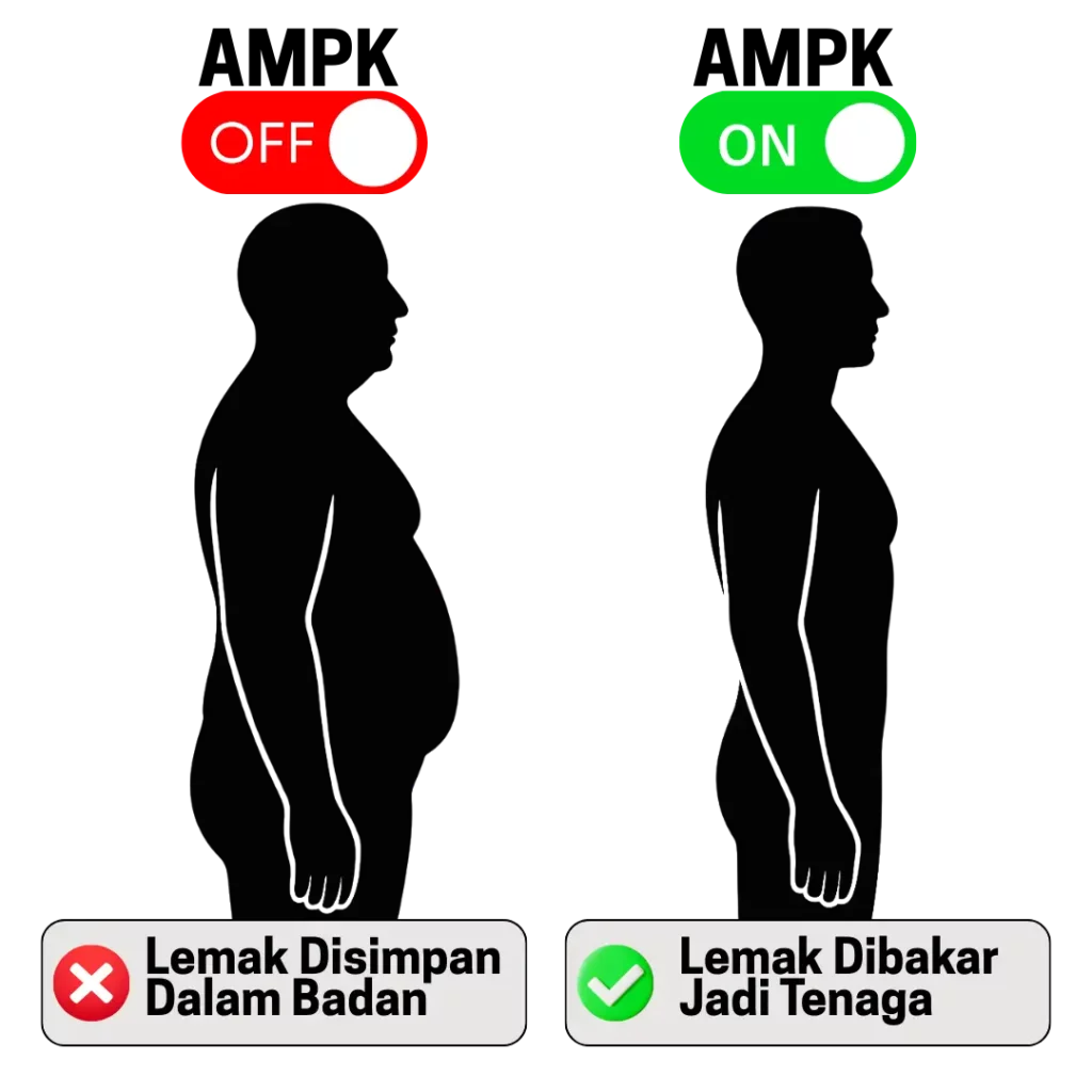 👉 Ia dicipta khusus untuk aktifkan AMPK switch dalam tubuh — mekanisme semula jadi yang menentukan sama ada badan simpan lemak atau tukar lemak jadi tenaga.