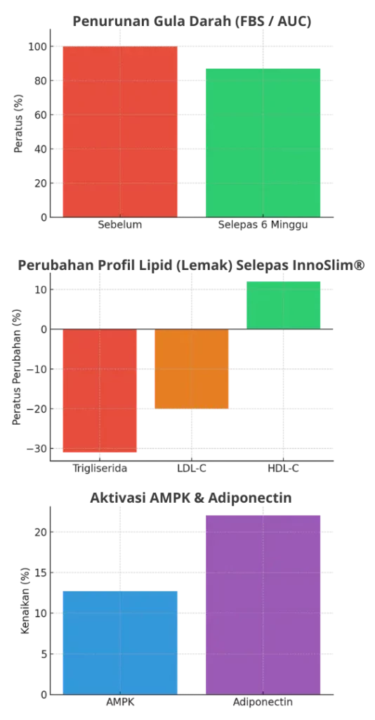 Gula darah turun hingga 13% Trigliserida turun >30%, LDL-C turun ~20% HDL-C naik 11.8%, adiponectin naik 22%, AMPK aktif naik 12.7% Diiktiraf selamat (GRAS) oleh panel pakar bebas
